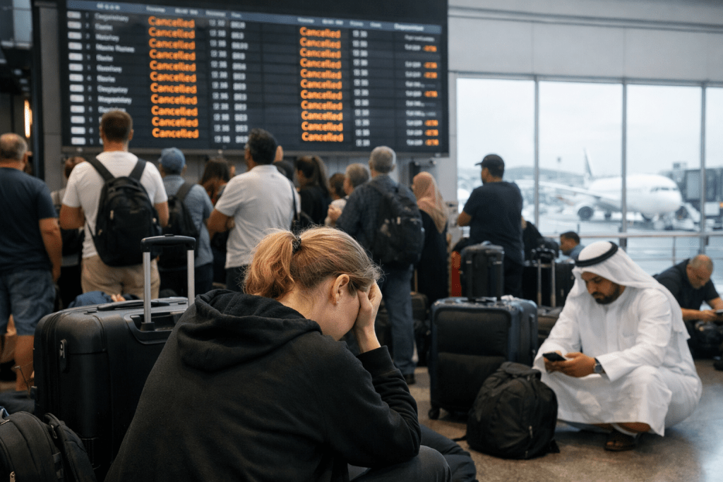 Key transit hubs such as Dubai, Abu Dhabi, and Doha saw cancellations and operational delays as airlines adjusted schedules.
